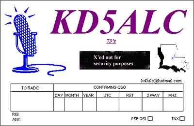 This is a picture of the QSL card that I built. I spent a lot of time and ingenuity in building it. If you want one then you know what to do..... Make a contact with me over the air and I'll be glad to send one to you. I have to say that I love amatuer radio as a first and foremost hobby. There is a lot more to gain from being a ham operator than a bunch of QSL cards. I have gained a multitude of knowledge from being a ham. But most of all I have made a lot of friends and have had a chance to show that when people come together with one goal in mind that anything can be accomplished. I thank all of the people who give to this hobby and all who donate their time in bringing others to it. Give it a try, you might find that it was the best decision in the aspect of a hobby that you've ever made. | QSL IMAGE | ||||||||||||||||